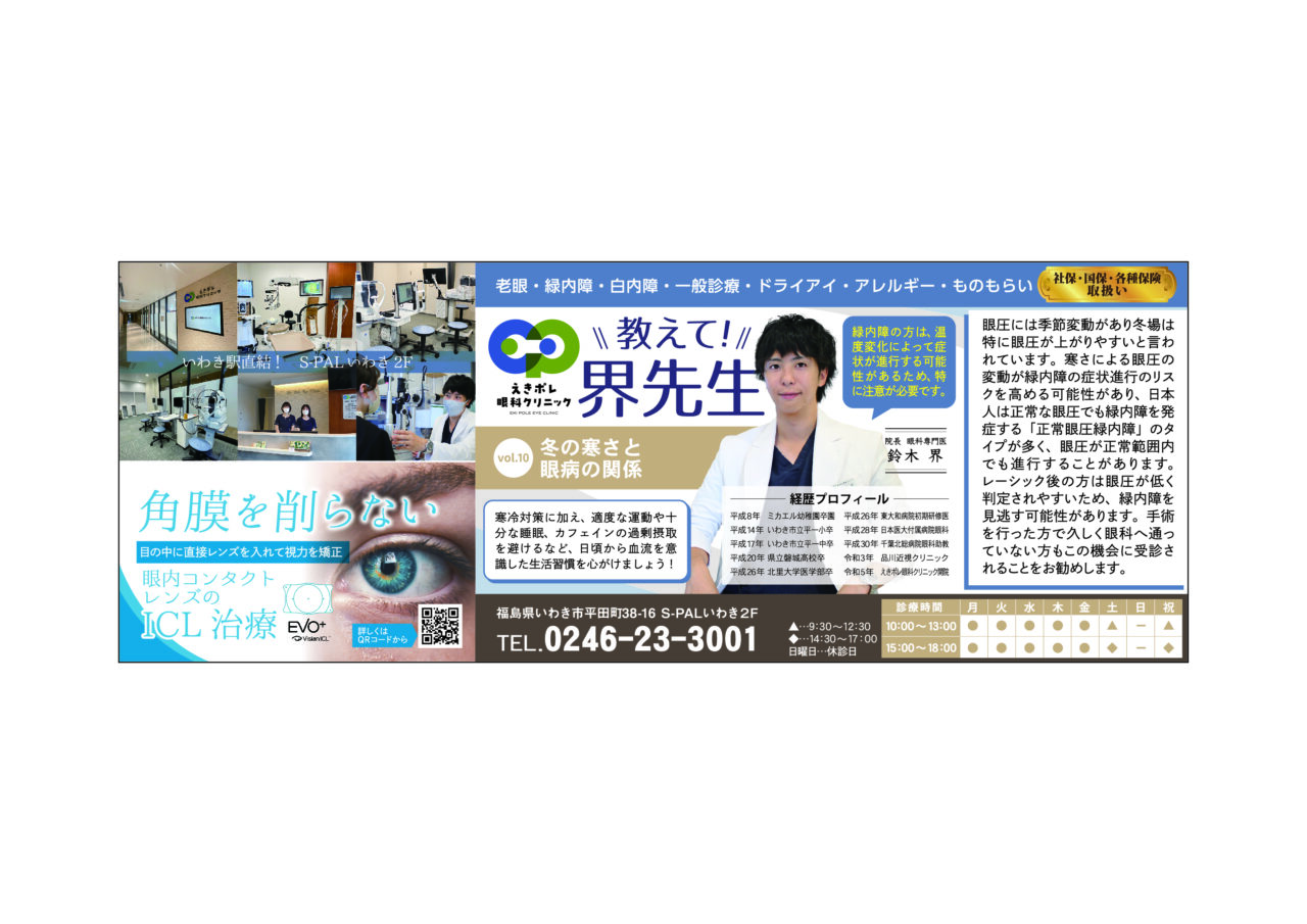 眼圧には季節変動があり冬場は特に眼圧が上がりやすいと言われています。寒さによる眼圧の変動が緑内障の症状進行のリスクを高める可能性があり、日本人は正常な眼圧でも緑内障を発症する「正常眼圧緑内障」のタイプが多く、眼圧が正常範囲内でも進行することがあります。レーシック後の方は眼圧が低く判定されやすいため、緑内障を見逃す可能性があります。手術を行った方で久しく眼科へ通っていない方もこの機会に受診されることをお勧めします。
