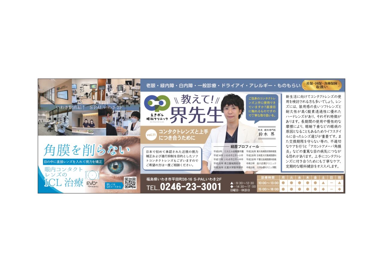 新生活に向けてコンタクトレンズの使用を検討される方も多いでしょう。レンズには、装用感の良いソフトレンズと耐久性が高く酸素透過性に優れたハードレンズがあり、それぞれ特徴があります。長期間の使用や慢性的な摩擦により、眼瞼下垂などの眼病の原因となることもあるためライフスタイルに合ったレンズ選びが重要です。また交換期限を守らない等の、不適切なケアを行うと「アカントアメーバ角膜炎」などの重篤な目の病気につながる恐れがあります。上手にコンタクトレンズに付き合うためにも丁寧なケア、定期的な眼科健診をオススメします。