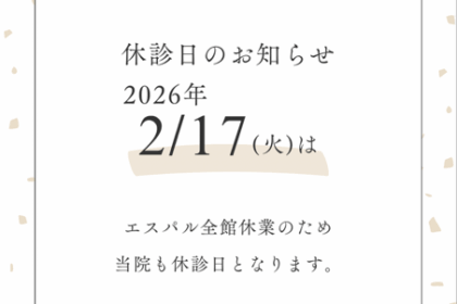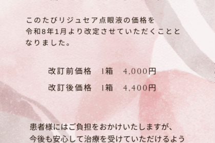 2025.11.25 お知らせ 休診のお知らせ 2025.11.25 お知らせ 年末年始休診のお知らせ 2025.11.18 お知らせ 当院の院長はIPCL認定医です 2025.11.10 お知らせ リジュセア点眼液価格改定のお知らせ 2025.10.20 お知らせ インフルエンザ点鼻ワクチン「フルミスト」について 2025.09.16 お知らせ 9/16からインフルエンザワクチン予防接種を開始いたしました💉✨ 2025.08.27 お知らせ ICL指導医 認定のお知らせ 2025.08.05 お知らせ 梅本医師について大切なお知らせ 2025.07.01 お知らせ デジスマ決済が可能となりました! 2025.06.26 お知らせ 診察券発行終了のお知らせ 2025.06.25 お知らせ 夏季休業のお知らせ 2025.06.20 お知らせ オルソケラトロジーのご案内 2025.06.18 お知らせ 9/2(火)休診のお知らせ 2025.04.28 お知らせ 帯状疱疹ワクチンのご案内 2025.03.26 お知らせ 当院の提携駐車場につきまして 1 2 … 4 »