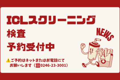 2026.01.17 お知らせ ICLスリーニング検査 2026.01.16 お知らせ 院長コラム更新しました。 2026.01.15 お知らせ オルソケラトロジー・近視抑制専門外来 2026.01.14 お知らせ フルミストのお知らせ 2025.12.26 お知らせ インフルエンザワクチン接種1/31までになります。 2025.12.26 お知らせ S-PALいわき3周年イベントのお知らせ 2025.12.19 お知らせ 1月診療日程 2025.12.05 お知らせ インフルエンザワクチンの接種を受けられる方へ 2025.11.25 お知らせ 休診のお知らせ 2025.11.25 お知らせ 年末年始休診のお知らせ 2025.11.18 お知らせ 当院の院長はIPCL認定医です 2025.11.10 お知らせ リジュセア点眼液価格改定のお知らせ 2025.10.20 お知らせ インフルエンザ点鼻ワクチン「フルミスト」について 2025.09.16 お知らせ 9/16からインフルエンザワクチン予防接種を開始いたしました💉✨ 2025.08.27 お知らせ ICL指導医 認定のお知らせ 1 2 … 5 »